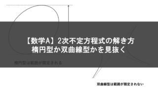 高校数学 【数学A】2次不定方程式の解き方|楕円型か双曲線型かを見抜く 2次不定方程式の解き方について解説します。2次不定方程式の解き方2次不定方程式の解き方について解説します。2次不定方程式の解き方2次不定方程式には、「楕円型方程式」と「双曲線型方程式」の2種類あります。まずは、与えられた方程式が「楕円型方程... 2025.12.21 高校数学